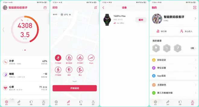 刚刚有提到,dido Y60Pro Max采用全屏触摸+单按键操控设计,这颗按键在表侧面,系统操作的逻辑还算是简便易学。首次开机,长按表盘右侧控制键手表开机后,搭配使用专用App“WOFIT”连接蓝牙就可以绑定手机,进行手表监测数据同步,通过APP进行查看,同时也可以 和手机联动接打电话和查看消息等。