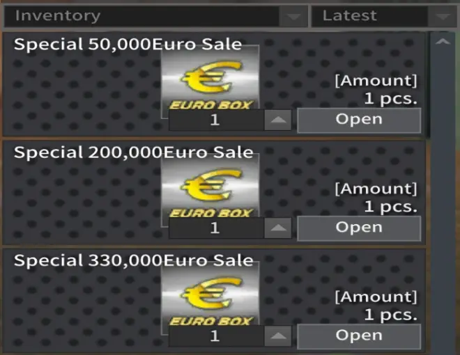 请注意,购买箱子后,您需要打开库存中的箱子才能获得欧元。