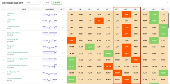 我们通过进行年度汇总就可以看到,不论排名靠前还是靠后一点的词,排名最好的月份是夏季这三个。