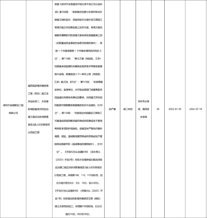 承建工程存较严重不良行为,深圳市金润建设工程有限公司被扣30分
