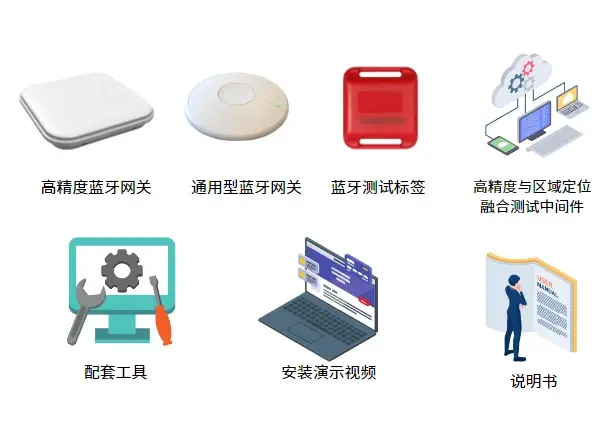 高精度蓝牙网关1个、通用蓝牙网关2个,蓝牙测试标签2个、高精度与区域定位融合测试中间件1个、配置工具1套、安装演示视频1个、产品说明书1套。