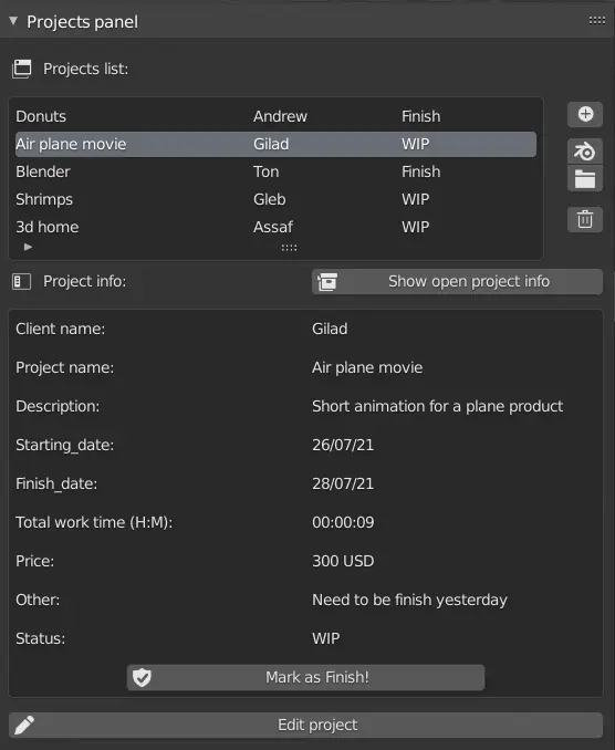 1.在blender中管理您的blender项目和客户,跟踪您的项目进度并将所有项目详细信息(项目状态、项目开始和结束日期、项目收入、客户名称等)保存在blender N-Panel中。