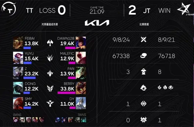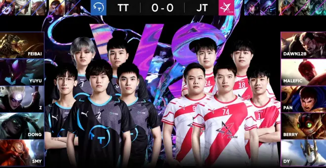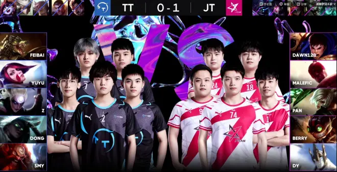 先输一局的TT,在第二局背水一战,在前18分钟打得非常出色,一度经济和人头数都领先于JT。但是排名第二的JT,相较于TT,在面对逆风局的经验上要更胜一筹。在逆风局的时候,JT耐心和TT拉扯,并伺机寻找机会。终于在18分钟左右的小龙团时找到了机会,JT在盖伦被击杀的情况,破釜沉舟的接团,随后打出1换3,并收下双龙;21分09秒,JT携大龙BUFF,一举推上TT高地,以2:0的成绩拿下了本场比赛的胜利!