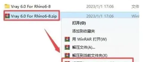 1.选中下载的压缩包,然后鼠标右键选择解压到“Vray 6.0 For Rhino6-8”(没有解压选项点这里)