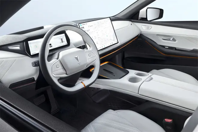 内饰部分,新车设计风格很简洁,配备了全液晶仪表盘、双辐式多功能方向盘以及14.6英寸的悬浮式中控多媒体显示屏,中控屏可左右旋转最大15°。黑色的面板与灰色的车顶相搭配的恰到好处。相较现款车型,方向盘的亮银色装饰元素面积更大,白色方向盘下方增加一抹电镀橙色喷漆装饰,看起来时尚不少,两侧的功能按键也有微小的调整。