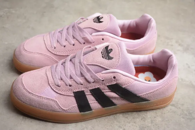 阿迪达斯阿罗哈联名 Adidas Aloha Super Mark Gonzales One Black Eye 粉德训运动鞋HQ2032。粉色的防尘袋,后跟图案不一样,反绒革组合纤维革鞋面材质。鞋垫是红色带印花,外置耐磨橡胶大底,抽屉原盒,鞋舌是小幽灵。