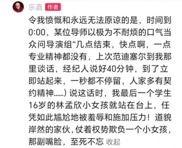 更令他感到愤慨和无法原谅的是,当时间到夜里12点的时候,某位导师极不耐烦地当众催导演组早点结束,让他战队的选手承受了巨大的压力。乐嘉说,这位导师的嘴脸,他至死不忘。