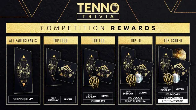 - 前10名玩家:TennoTrivia飞船用展示图,10000白金、500杜卡德金币和一个TennoTrivia 浮印。
