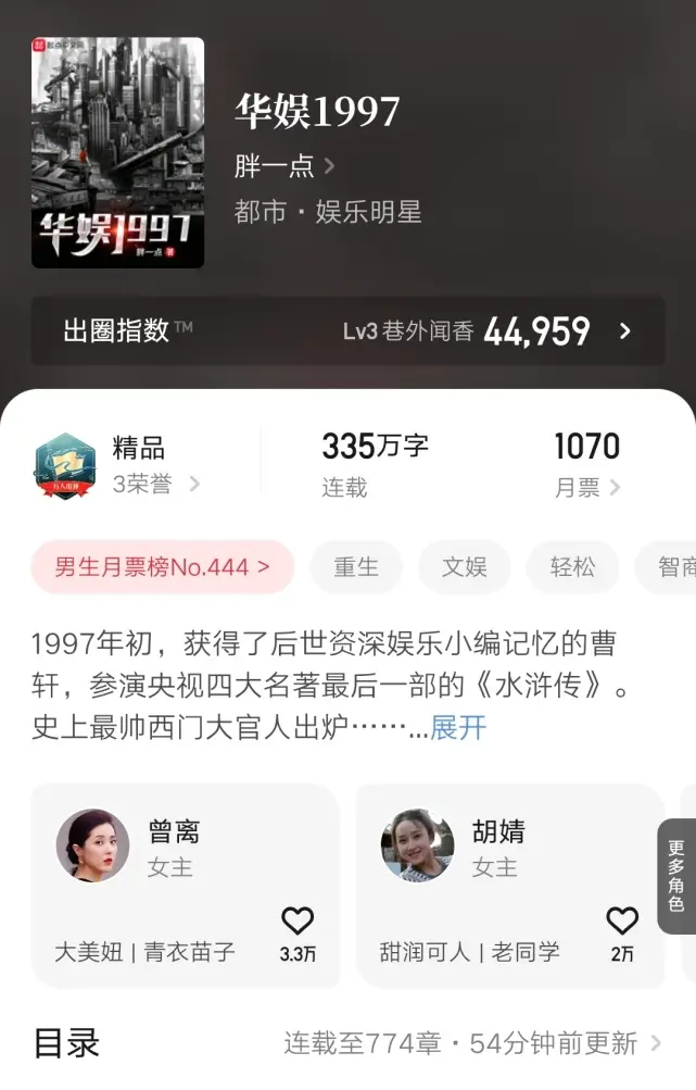 胖一点在今天开了文娱题材新书《骂谁实力派呢》,与此同时他的老书《华娱1997》说是还有几章番外就真的结束了。自从去年年底1997的正文完结后,他就在进行番外填坑,这一填就是近两个月,简直就是把番外当正文来写了。