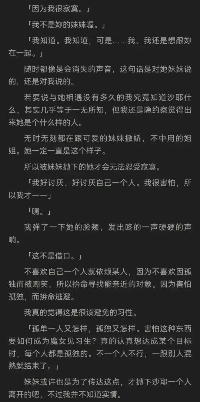 孤独十分好理解,小说原文中提到了很多次孤独,包括沙耶一个人的孤独,被妹妹抛弃的孤独,逃避现实的孤独,到了最后被伊蕾娜一番话感动而不再孤独。