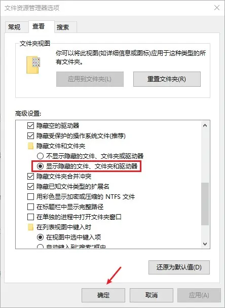 步骤3. 点击查看,在高级设置窗口找到隐藏文件和文件夹,选择显示隐藏的文件、文件夹和驱动器,最后点击确定。