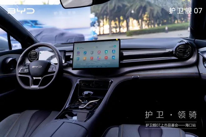 智能化方面,护卫舰07全系标配5G通讯技术的DiLink智能网联系统和15.6英寸自适应旋转悬浮Pad,在UI设计、智能语音均处在比亚迪整个品牌内的最高水准。