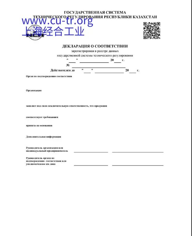 哈萨克斯坦共和国符合性声明(DoC RK)是一个固定格式的证书,证明产品符合哈萨克斯坦国家立法的要求,由制造商/合规者(自己负责)采用。