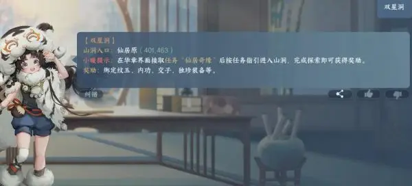 1、我们先来到双星洞的门口,可以看到有个前置任务双峰照影。
