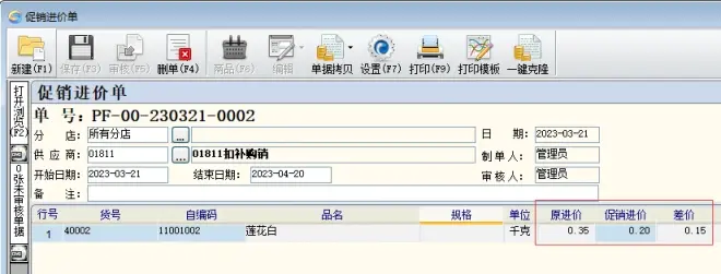 相关路径:总部——促销——促销进价单。例如:货号40002 莲花白 ,供应商01811告知从2023-03-21到2023-04-20期间,该商品价格从原来的0.35元下调至0.2元,通过【促销进价单】,可以定义该供应商,促销时间范围,以及商品价格信息。信息定义完成后,保存审核此单即可。