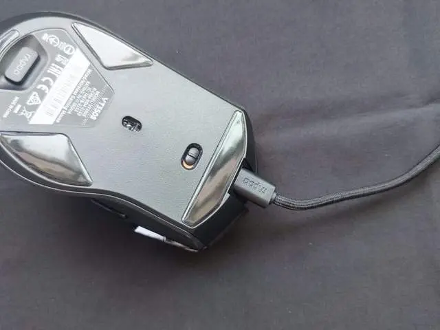 鼠标的背面可以看到,在前端有一个Type-C接口充电,或者通过数据线连接电脑变成有线连接,Type-C接口比较小,只能通过自带的线材进行连接。中间是光学引擎,另外有4个特氟龙脚垫,前脚垫旁边有一个开关,最下面则是2.4G无线接收器磁吸收纳仓,磁吸更稳定、更方便。