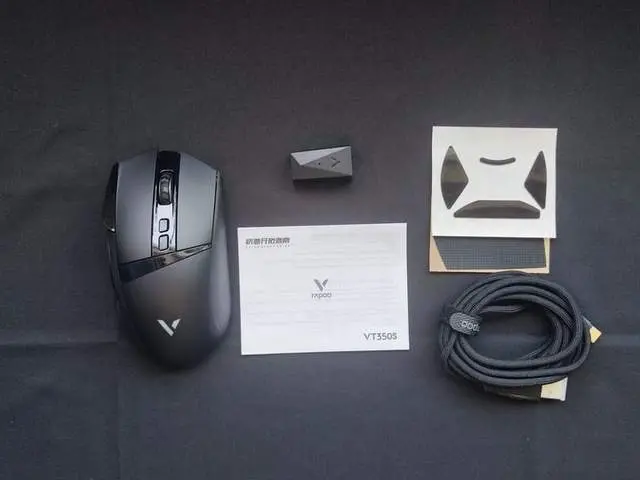 雷柏VT350S鼠标配件全家福:雷柏VT350S鼠标、1.8米伞绳电源数据线、USB转接头、防滑贴、特氟龙替换脚贴以及产品说明书。其中电源线特别轻,更柔软,在使用中减少摩擦阻力,反应更加灵敏。