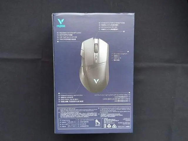 雷柏VT系列的设计外包装上都差不多,整体为蓝色背景,鼠标的大图在前,VT305S的型号在后,右上角是雷柏的logo,右下角是不同语言的有线无线双模游戏鼠标。包装的背面是一些介绍,比如上半部分是关于鼠标的按键、功能、特色,下半部分简单说明厂家等相关信息。