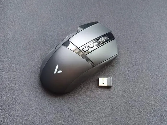 雷柏VT350S的外观上为流线造型,非左右对称结构,左侧略低,主要为主右手玩家的人体工学设计,整体黑色,按键和后部是磨砂材质,中间用了高反光材质,鼠标整体造型弓部弧度比较大,鼠标的长度相对来说稍微短一些,适合中大手的玩家。侧面的处理,使用了磨砂工艺,能提供一定的防滑性,左侧的内凹也可以给大拇指提供比较好的承托。