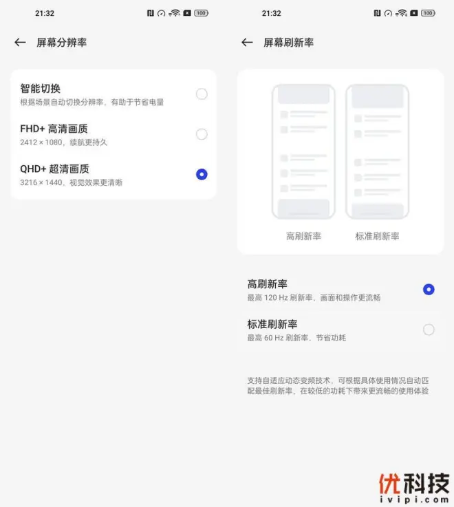 至于屏幕分辨率方面,系统内日工智能切换、FHD+以及QHD+三档可选,建议选择智能切换即可,因为系统会根据场景自动切换分辨率,这也有助于省电。而屏幕刷新率方面具备高刷新率和标准刷新率两档可选,默认选择高刷新率即可,毕竟一加11的LTPO3.0的表现还是非常不错的。