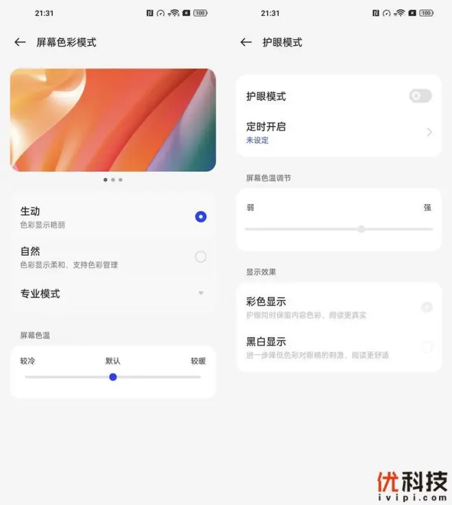 屏幕的色彩模式方面,系统内提供生动、自然和专业模式可供选择,另外还支持屏幕色温的手动调节,至于护眼模式则支持定时切换功能。