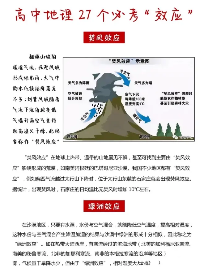 高中地理:27个必考“效应”,提早了解,考试至少再提20分高中地理的地理效应部分是历年考试的常客,但课本上涉及到的地理效应并不全面。课本上只有简单的“热岛效应,温室效应”等,其实作为高中生要掌握的远远不止这些,学霸早就已经偷偷走在你的最前面,将这些都掌握了。所以,今天学姐给同学们分享整理的是高中地理27个比较效应,逢考必出,建议打印学习哦!