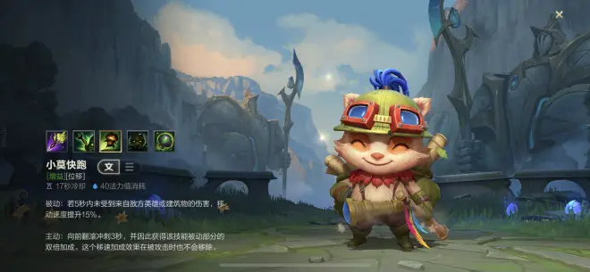 w技能赋予提莫非战斗状态下的高机动性,而技能开启效果则可以视为一小段位移,这赋予了提莫很大的游走空间 四、e技能(三技能)