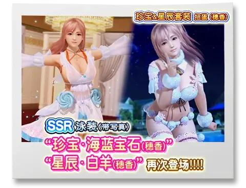 在“珍宝&星辰套装扭蛋(穗香)”中,SSR和SR泳装仅限“穗香”的专用泳装。SSR泳装“珍宝·海蓝宝石(穗香)”、“星辰・白羊(穗香)”是PICK UP的泳装,并且排出时的泳装等级必定为Lv.90。