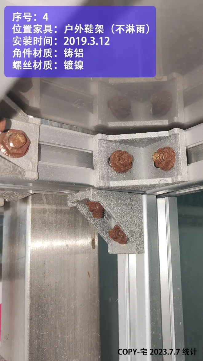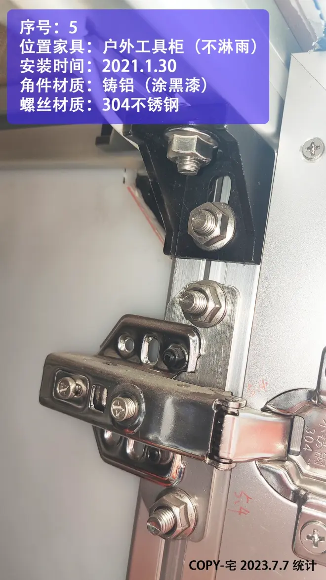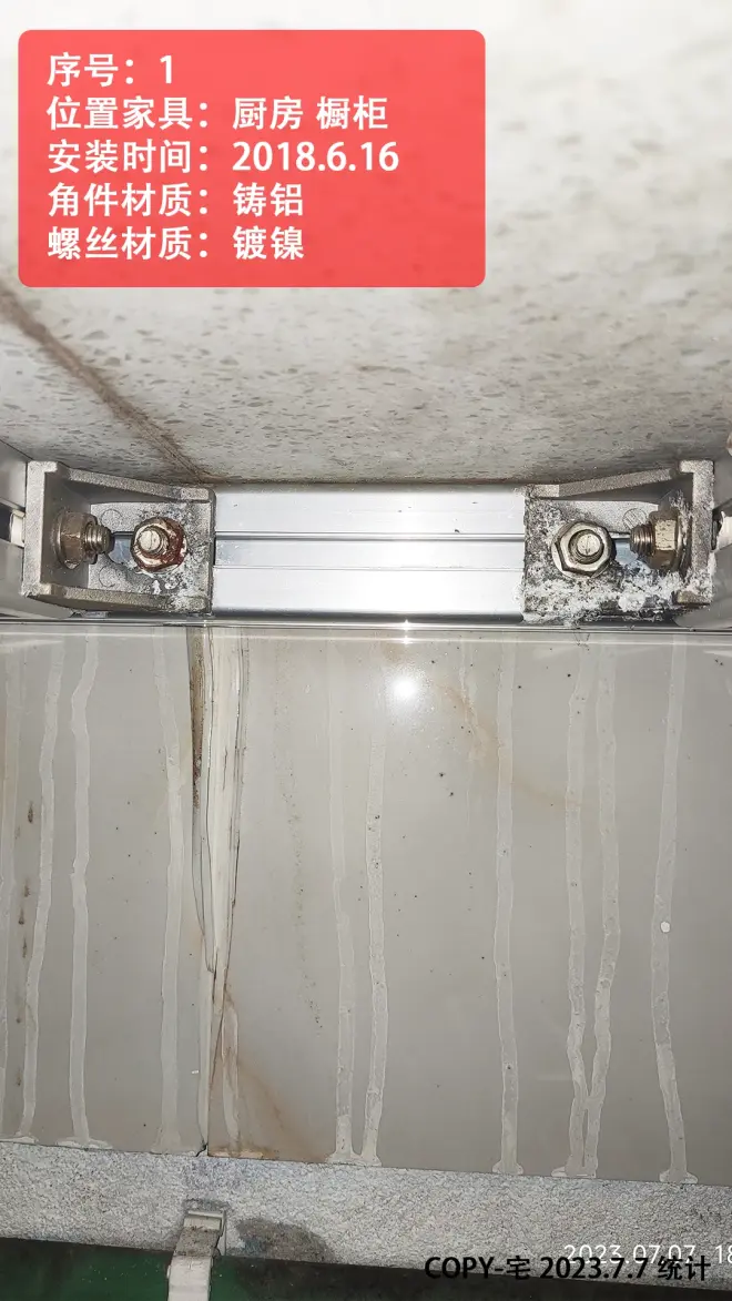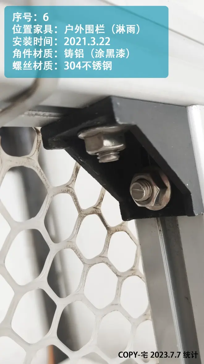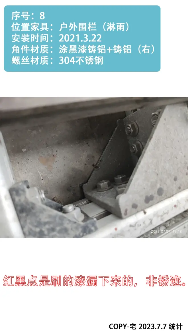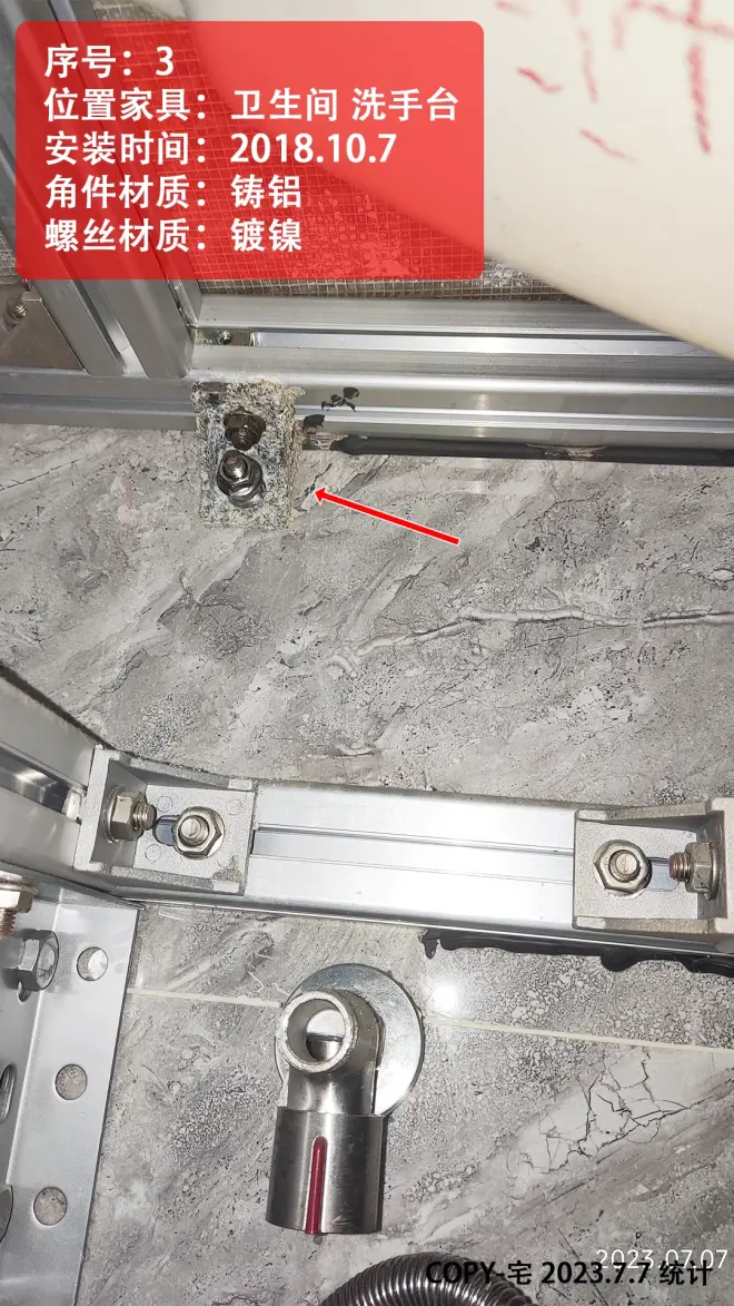 2.水槽 洗手台附近 以及户外不淋雨位置,建议用 涂黑漆的铸铝角件(或铝合金角件)+304不锈钢螺丝;