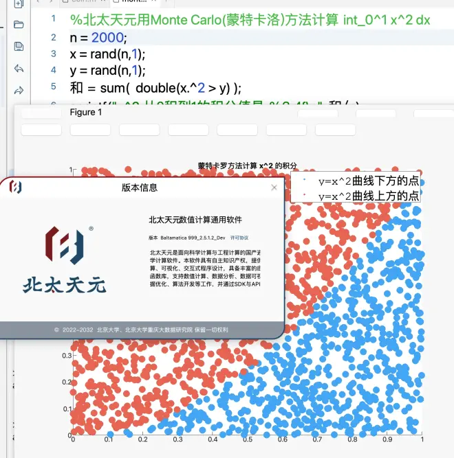 %北太天元用Monte Carlo(蒙特卡洛)方法计算 int_0^1 x^2 dx