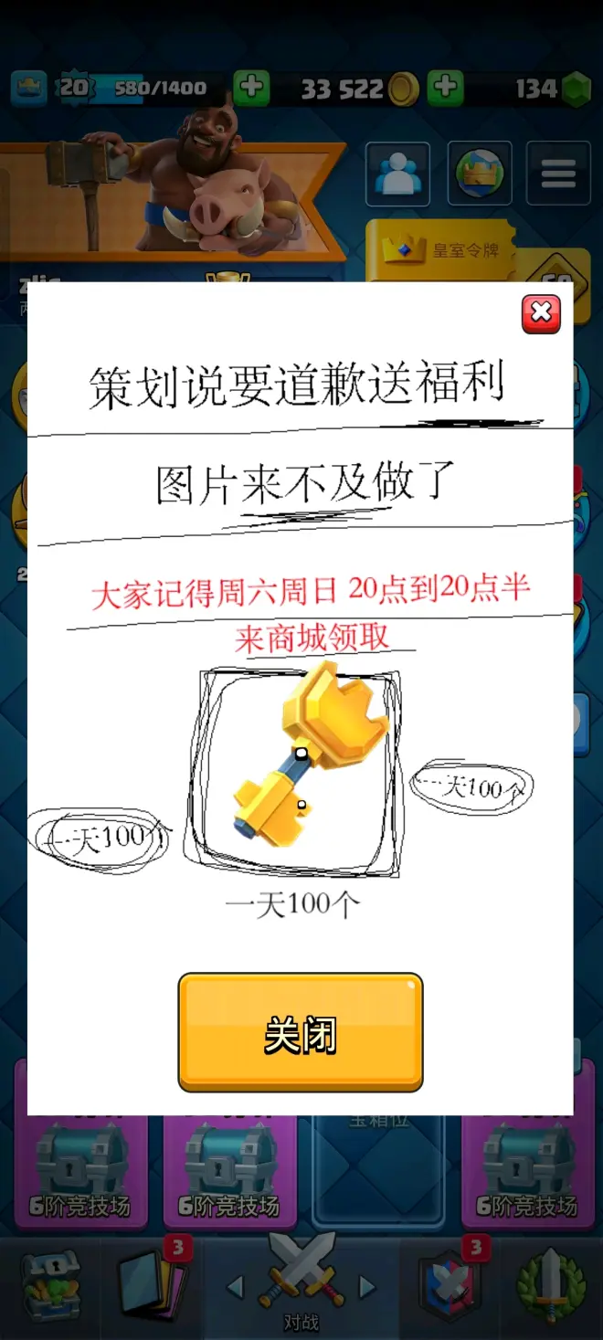 皇室战争策划道歉送福利一天100钥匙,在19~20号8点商城领