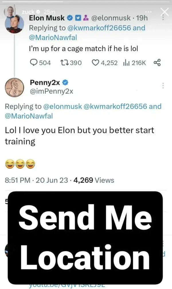 马斯克的这条推文并没有得到扎克伯格的直接回复,但是第二天,扎克伯格在Instagram上发布了马斯克的推文截图,并配文“把地址发给我”。