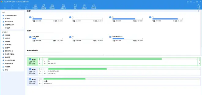傲梅分区助手界面非常扁平化,最大的区域就是磁盘信息部分,磁盘和分区全部识别出来,再根据所需进行操作。