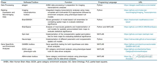 本文概述了与进行成像转录组学分析相关的几个关键考虑因素(图6)。对这些考虑因素的详细研究强调了在做出处理和分析选择时需要注意的事项。目前已经开发了几个开源工具箱,可以实现每个分析阶段列出的许多最佳实践过程(表1)。然而,即使依赖于这些工具,也需要根据具体情况仔细考虑,以获得有效的推断和可再现的结果。此外,任何使用AHBA数据的分析都必须考虑几个关键的限制因素。