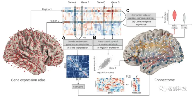 将转录数据转换成区域-基因表达矩阵后,下一步是将这些测量与某些神经影像学表型相关联。在这种情况下,通常使用三种主要方法之一来概括基因表达数据(图3)。第一种是基因共表达分析,包括分析成对基因(跨脑区)表达模式之间的空间相关性。对于所有基因对,结果可以表示为一个(对称的)基因-基因矩阵,以分析基因表达相似性的模式(图3A)。该矩阵也可以使用一些聚合值(例如,矩阵或其子分量的特征向量,有时称为特征基因)进行概括,从而产生一个高度解释性的分量作为可以与成像数据相关联的空间地图。第二种分析侧重于区域基因表达,其中根据每个脑区定义的神经影像学指标评估选定基因或基因组的空间相关性。同样的原则适用于多变量分析,例如那些使用偏最小二乘法的分析,这些分析可以确定具有最大协方差的基因和成像测量的加权组合(图3B)。第三种分析考察了CGE,计算了所有成对脑区之间的相关性,量化了其基因表达谱的相似性。结果可以表示为一个(对称的)区域-区域矩阵,并直接与在区域对水平上测量的其他类型的数据进行比较,例如结构或功能连接(图3C)。