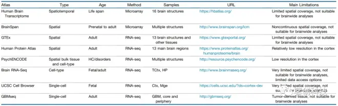 首先,基因表达与蛋白质丰度之间的关系很复杂,转录活性的变化不一定会影响蛋白质水平。其次,AHBA依赖于对大量组织样本的微阵列分析,由此产生的估计值可能受到细胞组成的区域差异的影响;因此,应尽可能使用单细胞RNA测序数据对结果进行交叉验证。第三,虽然AHBA旨在量化典型的转录模式,这些模式与其他死后组织库(表2)相比提供了无与伦比的空间覆盖率,但AHBA测量来自6个成年供体的小样本。AHBA各脑区基因表达的变异性比这6个个体大得多,这提示该图谱可用于研究稳健的区域表达谱,但对供体大脑代表性的担忧是有原因的。第四,AHBA仅测定成人大脑中的基因表达模式,但许多神经表型可能取决于发育过程中复杂且动态变化的基因表达模式。最后,由于AHBA数据是基于小样本的供体测量,因此在基因表达模式与影像学表型(或其他结果)之间发现的任何关系都是纯粹的相关关系,并不直接揭示因果机制。