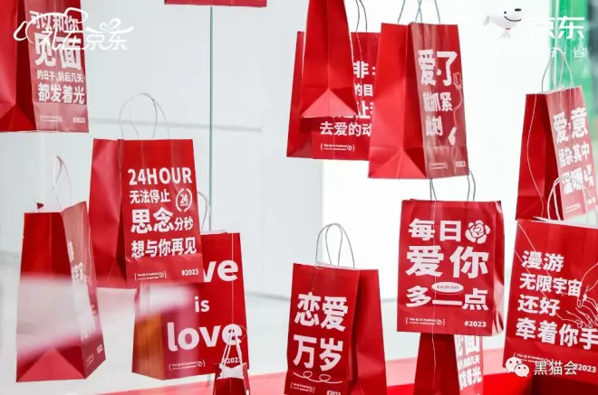 京东半开放式快闪打卡空间,足足3米高的玫瑰花瀑布,随便拍拍都很出片;还有77个悬挂的礼物袋,一抬头就能看到“满天星空”…除了拍照打卡,京东还准备了“投沙包”游戏,投中沙包即可获得100%中奖的刮刮卡。