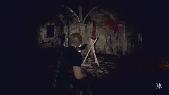 这里的环境很黑暗,需要用手电筒照明,此处对应的应该是原版3-1火焰机关楼下的地牢。不过这段流程进行了扩充,要素更为丰富,期间还能看到里昂侧身挤过墙缝的桥段。