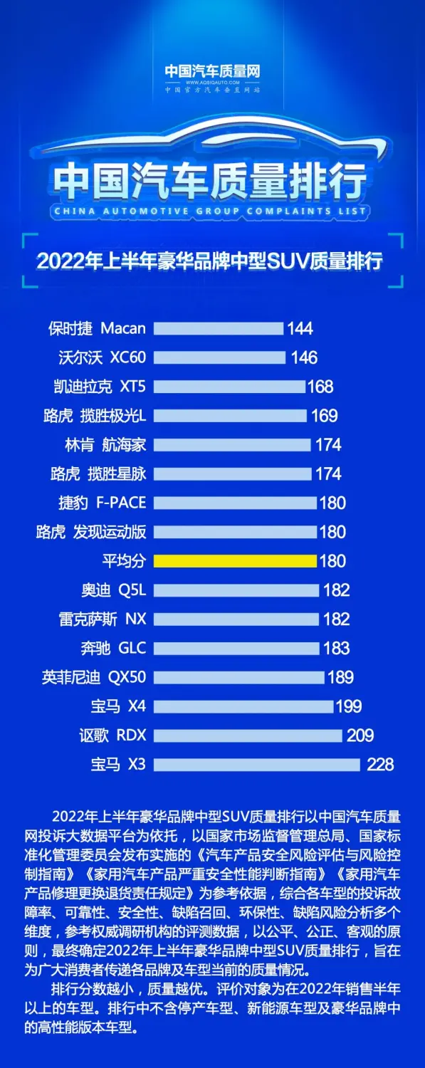 根据中国汽车质量网公布的数据来看,豪华中型SUV中质量达标的车型有8款,包含沃尔沃XC60、凯迪拉克XT5、路虎揽胜极光L等主流车型。