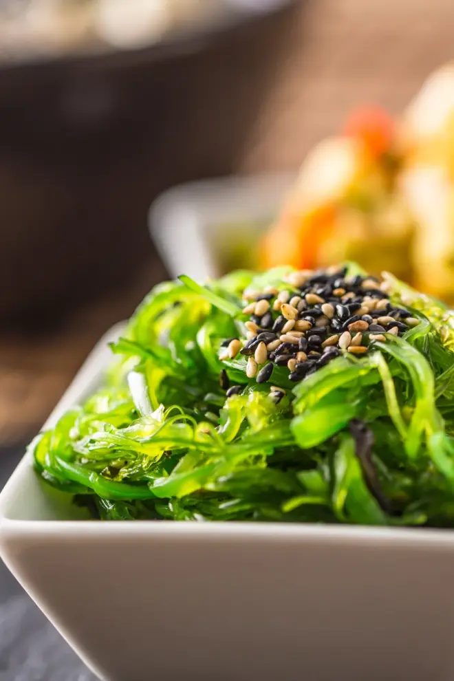 这种身姿曼妙的海草,往往生长于深约三至十米的清澈海域,舒展着硕大的叶片自由生长,每当海浪起伏时,宛如仕女裙带随之起伏,因而得名“裙带菜”——而在日本的店里,它们还有一个更加透露出产地信息的名称:中华海草。