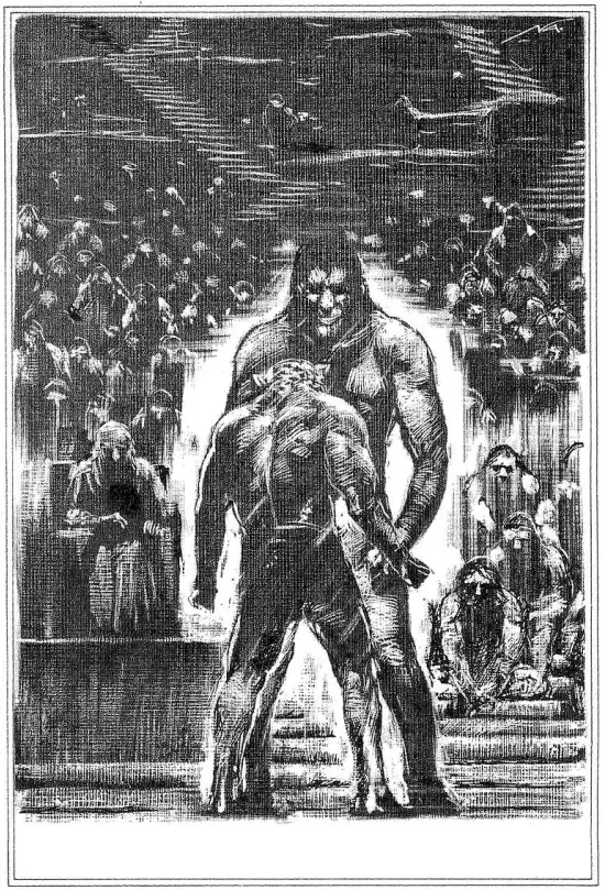不分昼夜随时可召开一场盛事的斗技场,四周的石阶看台上坐满了拉贡的战士、女人、表情困倦的幼童们;他们背后正好坐落于山峰轮廓正中的两张石椅之一上坐着的,是似乎对比赛结果毫无兴趣、眼睛半睁半闭的拉贡长老、白发多指的贤者卡昂;在他们所有人身后耸立的黑色岩山顶峰上方,铺开了如梦似幻的天幕,落入古音那一瞥的瞳孔中。