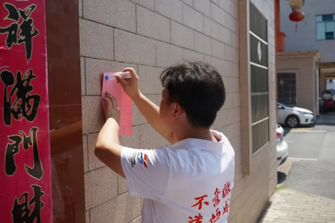 图为AI乡村振兴促进团队员在村门口粘贴防诈骗防溺水宣传。