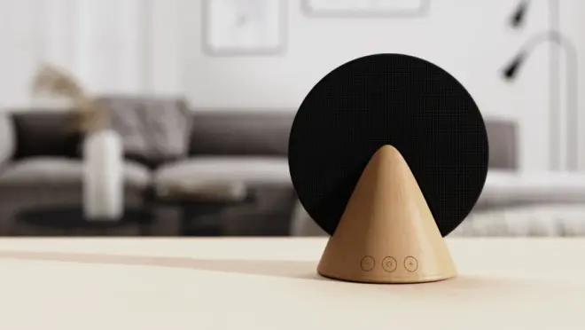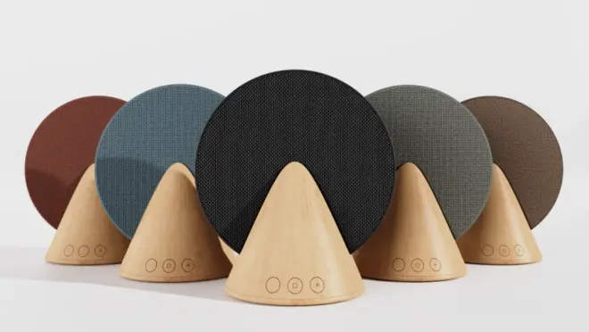 这款蓝牙扬声器通过组合两种几何形状实现了简单的设计和便携性。它由木质充电底座(锥体)和扬声器(圆柱体)组成。将扬声器放在家里时,木制底座以一种可以在为扬声器充电的同时提高其音质的方式固定扬声器。