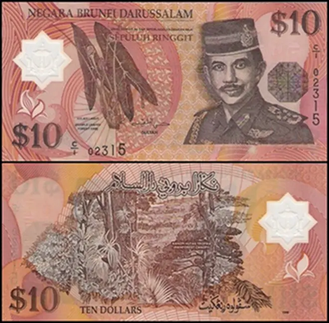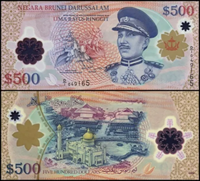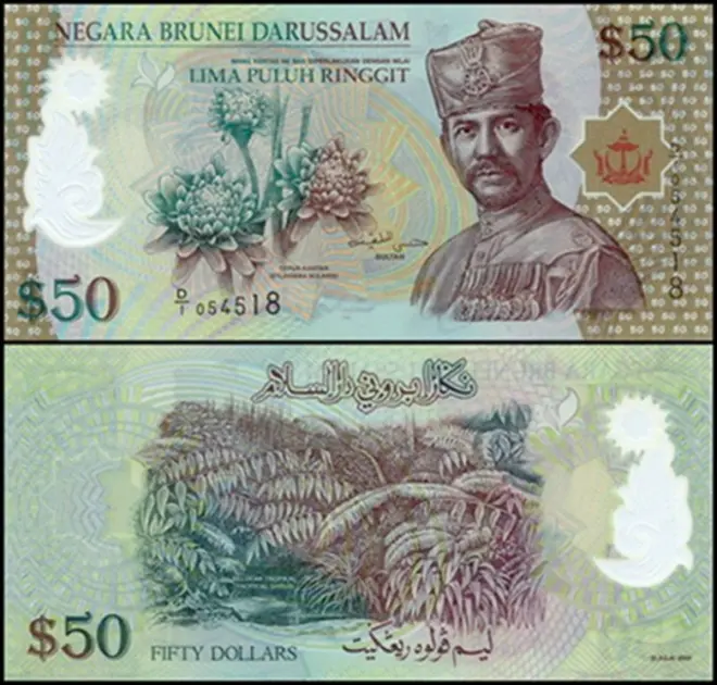 2017年10月5日, 文莱 将迎来该国元首 苏丹 哈吉·哈桑纳尔· 博尔 基亚(Haji Hassanal Bolkiah, 1946-)即位五十周年 大庆 , 文莱 央行将专门为此发行一枚面值50元的塑料纪念钞(面值约合人民币240元)。这枚纪念钞采用了尊贵的金黄色调,正面为 苏丹 肖像,背景是1968年加冕典礼的画面;背面则表现了 苏丹 亲民爱民。
