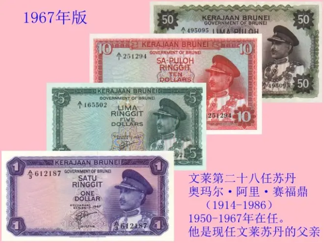 正面: 文莱 第二十八任 苏丹 奥玛尔· 阿里 ·赛 福鼎 Omar Ali Saifuddien III 1914-1986。1950-1967年在任。他是现任 文莱 苏丹 的父亲。