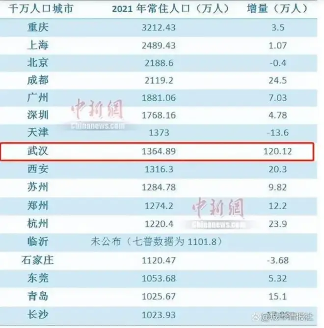 长江中下游的中心城市中,武汉是中部特大城市,成都是西部特大城市,但是在2021年公布的人口数据中,武汉的人口总数仅仅比成都的一半还多一点,距离2000万的常住人口目标还有很大的差距。