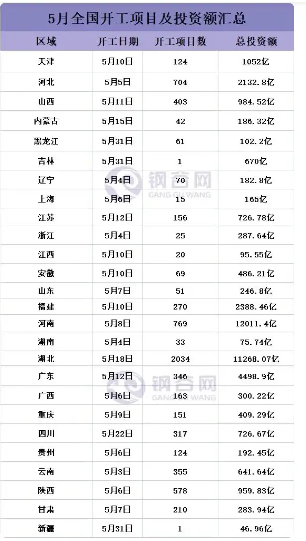 今年5月份,在全国新开工的项目中,湖北以2034个项目遥遥领先,投资总额为11268.07亿,位列全国第2,在经济大环境非常不景气的情况下,这样的数据显得非常扎眼。