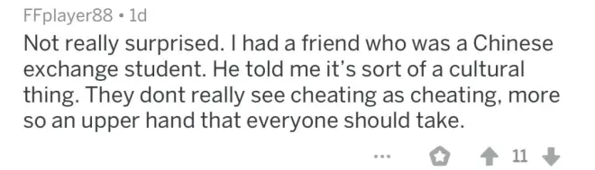 “一点也不意外。我有一个中国同学告诉过我,(作弊)中国文化的结果。他们所有人不觉得作弊是作弊,而是达成目的的一种手段”