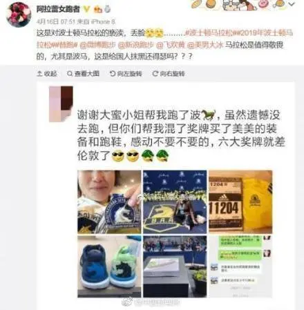 图:微博上有人晒出自己找人代跑波士顿马拉松
