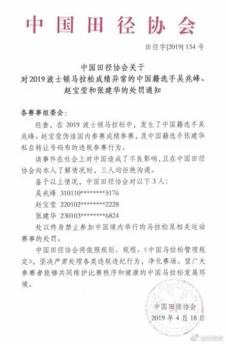 当然结果也是可以预见的:有选手历史成绩是3小时多,最后在波士顿却跑了6小时。两次成绩出入太大,导致赛事主办方和中国田径协会对此展开了调查。最后有三人被终身禁赛。